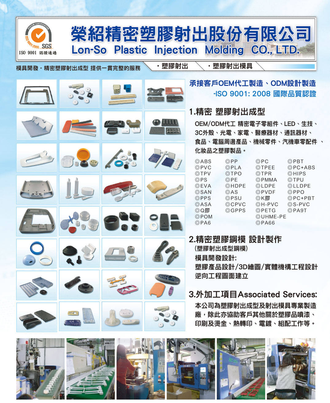 Taichung Sealine Plastic Injection Factory - Rongshao Plastic Injection Molding The samples in the picture above are for reference only. They are manufactured according to customized orders. Rongshao Plastic Injection Factory has a complete range of injection machines in tonnage. The entire factory uses quality inspection equipment and instruments. Our Customer service groups: OEM/ODM precision components, food packaging, medical equipment, LED, plastic gears, solar energy, 3C casings, plastic casings, optoelectronics, home appliances, communication equipment, computer peripherals, mechanical parts, automobile and motorcycle parts, Cosmetics, sports equipment, cameras, hand tools, construction, packaging materials, machine tools, ink cartridges, military equipment, aerospace, electronic parts, plastic products for biotechnology research and development.